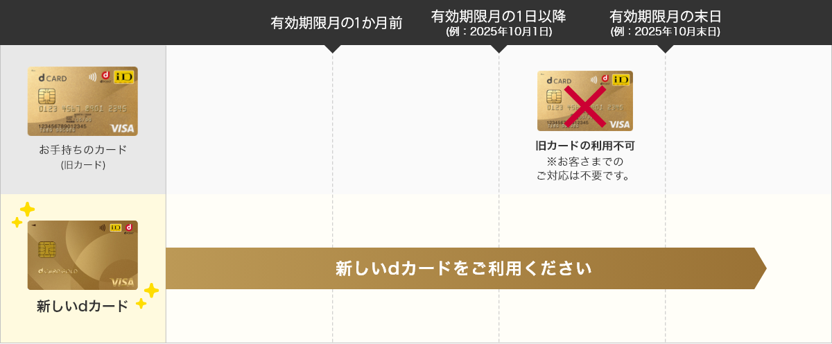 - 新しいdカードがお手元に届きましたら、以降はお届けしたカードをご利用ください。