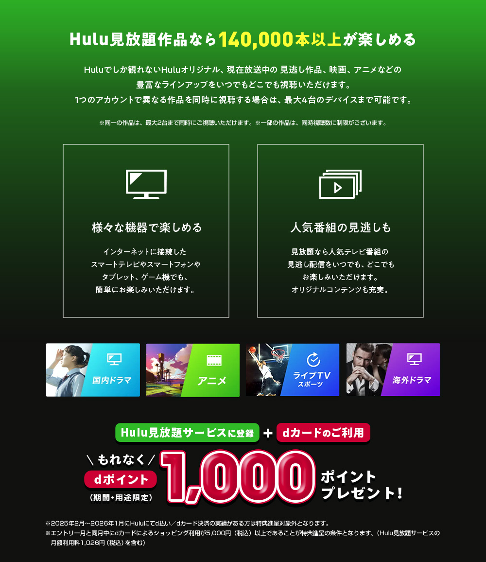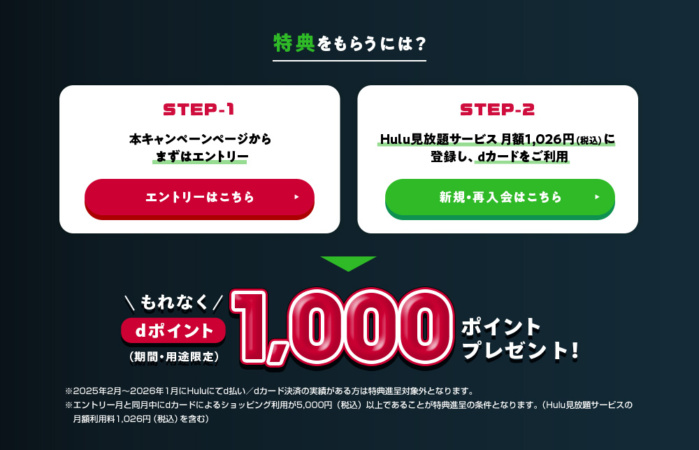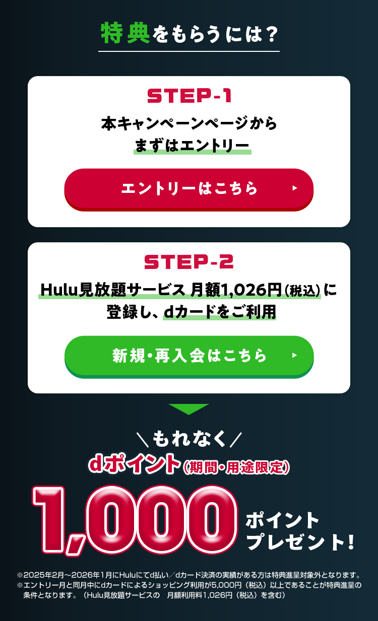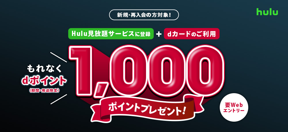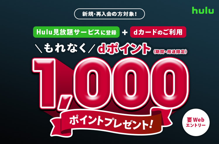 エントリーの上、本キャンペーンページ経由でHulu見放題サービス(月額1,026円(税込))に会員登録(新規/再入会不問)し、dカードをご利用いただくとキャンペーン特典としてdポイント1,000ポイントを進呈いたします。