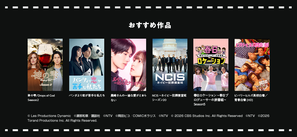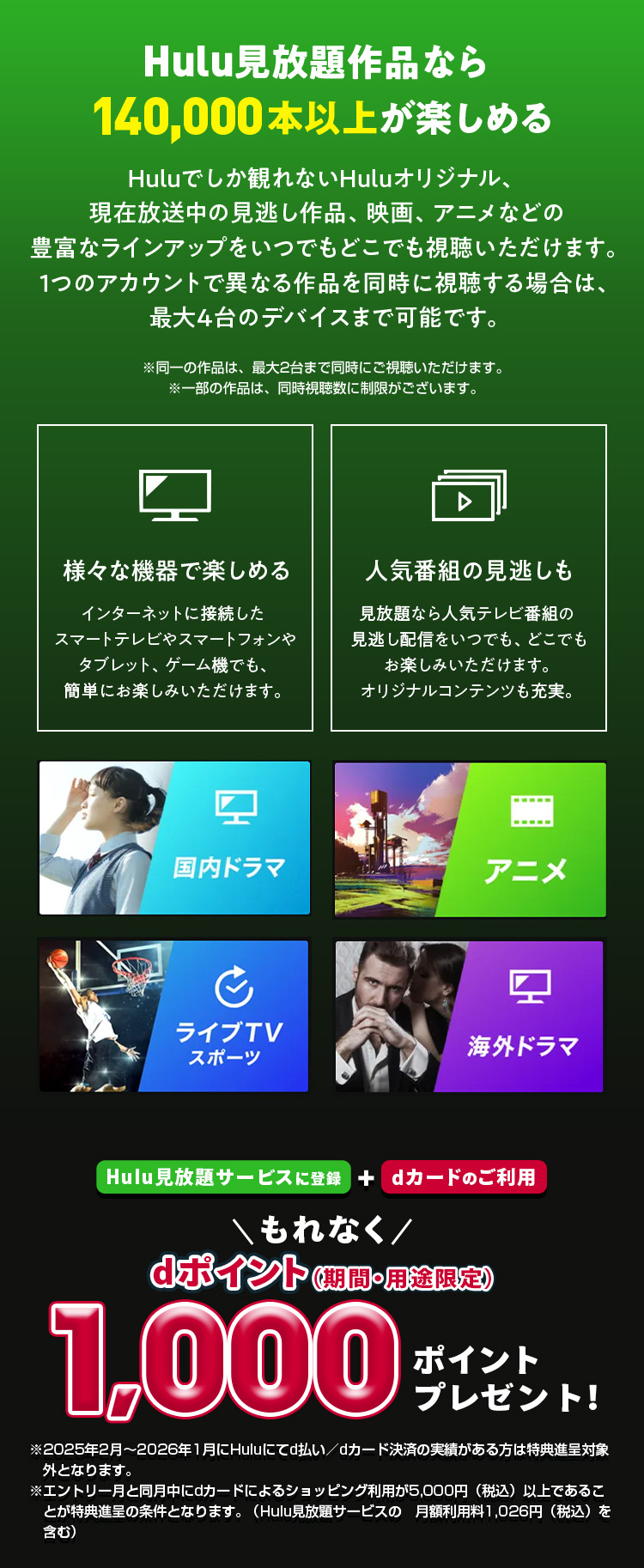※2025年2月~2026年1月にHuluにてd払い/dカード決済の実績がある方は特典進呈対象外となります。 ※エントリー月と同月中にdカードによるショッピング利用が5,000円(税込)以上であることが特典進呈の条件となります。(Hulu見放題サービスの月額利用料1,026円(税込)を含む) |