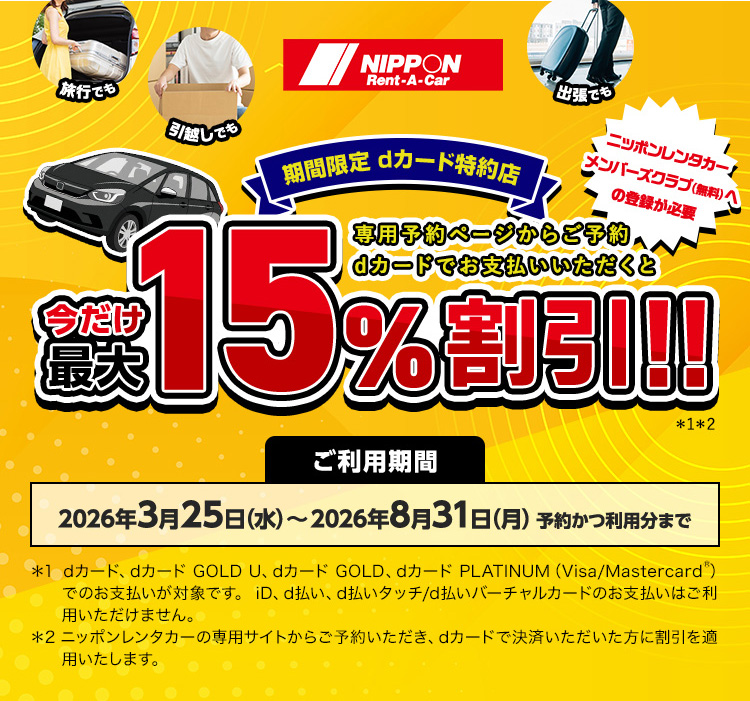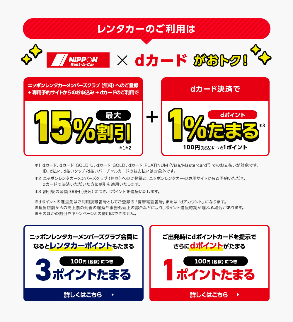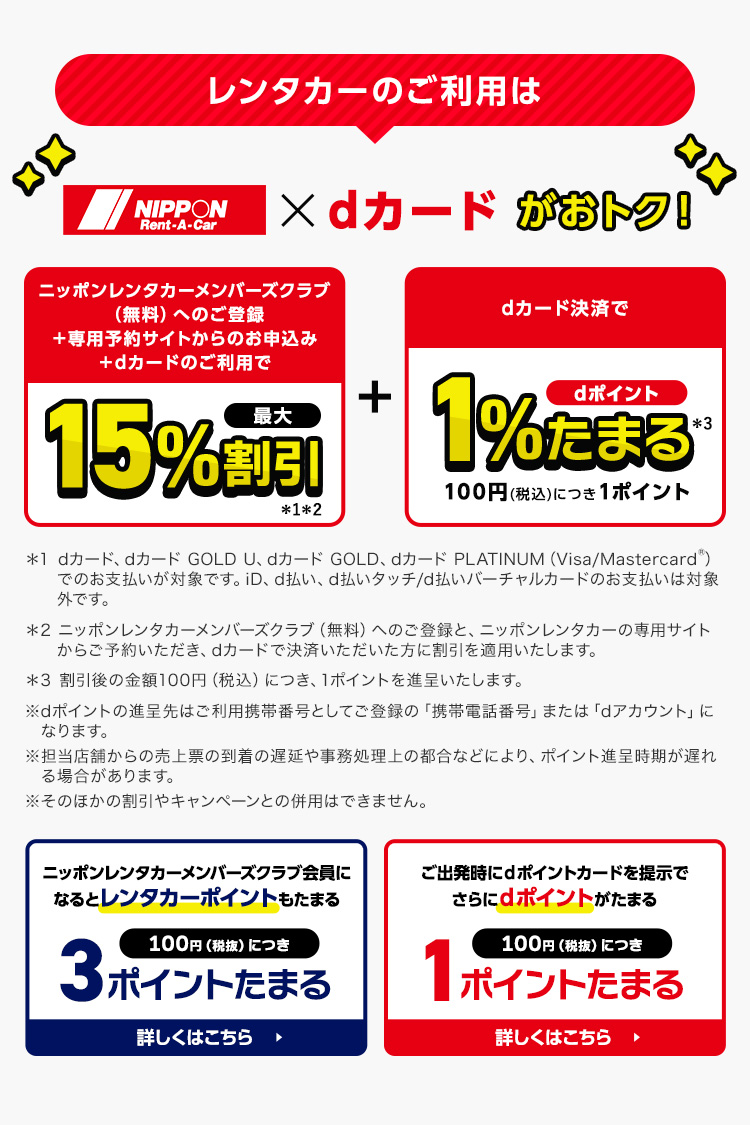期間中に専用サイトからご予約した上で対象カードで決済された方を対象に、最大15%割引をニッポンレンタカーにて実施します。 ※割引条件 下記①②③を満たすことが割引条件となります。 ①期間中に下記の専用サイトから予約および利用すること ②対象カードで決済すること ③ニッポンレンタカーの会員(ニッポンレンタカーメンバーズクラブ)であること |