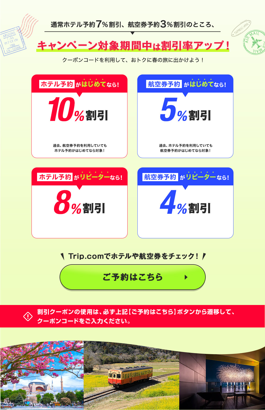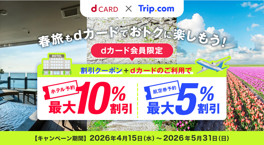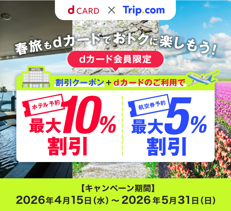 | キャンペーン名 | Trip.com×dカード 春のホテル・航空券割引キャンペーン |