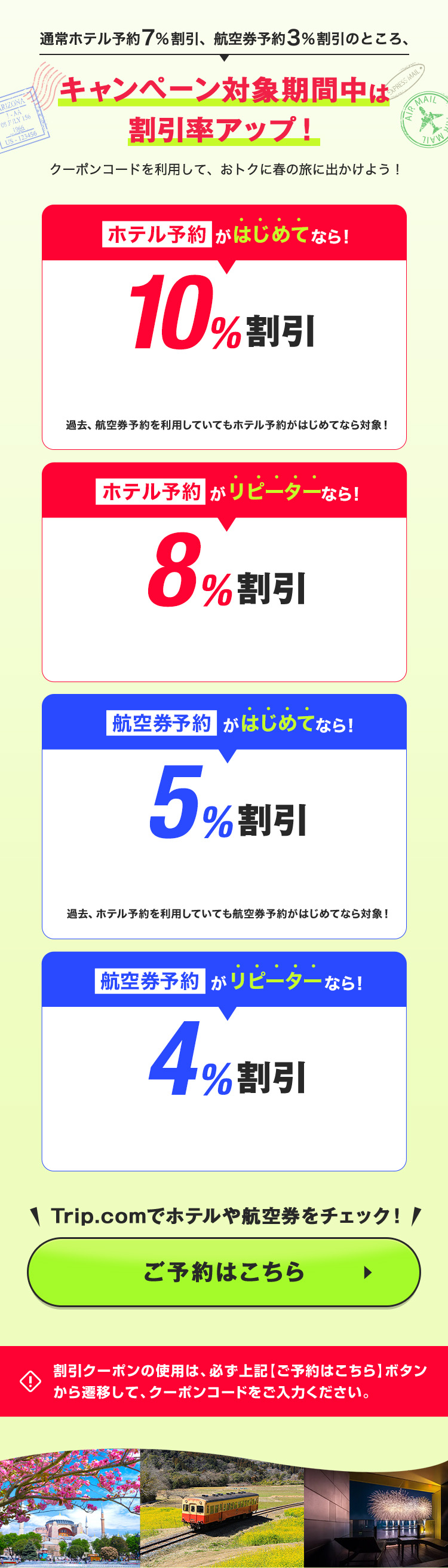 キャンペーン実施期間中にTrip.comにてクーポンコードを適用し、dカードでホテルまたは航空券のご予約を決済いただくと割引を適用いたします。 ■はじめての方 ※Trip.comの会員登録をしていない、はじめて利用される方 ホテル予約:10%割引 航空券予約:5%割引 ■リピーターの方 ※過去Trip.comの会員登録をして利用したことがある方 ホテル予約:8%割引 航空券予約:4%割引 |